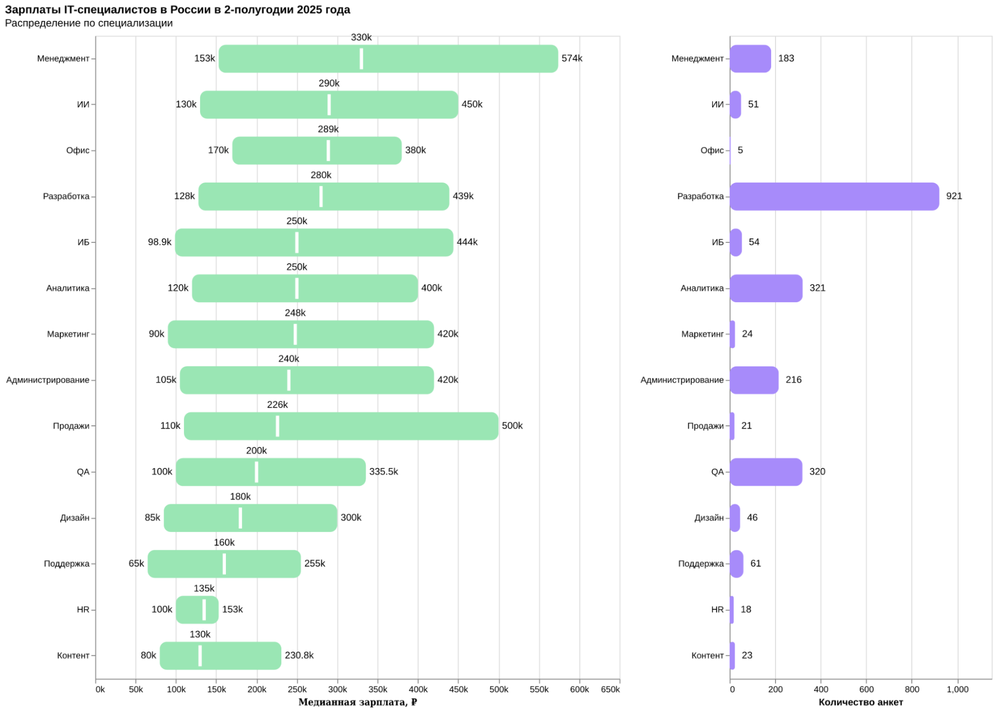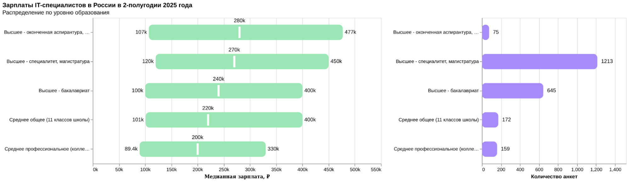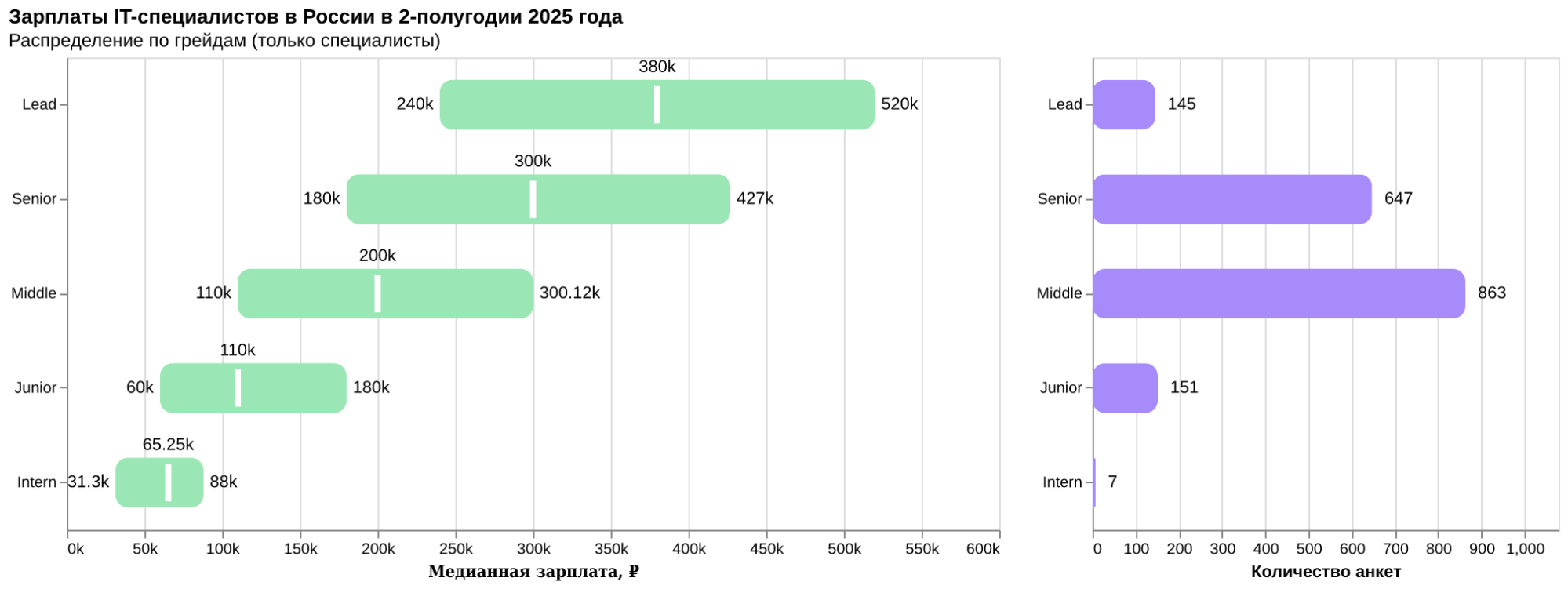 - Средняя отметка (медиана) — половина зарплат ниже этого значения, половина — выше.