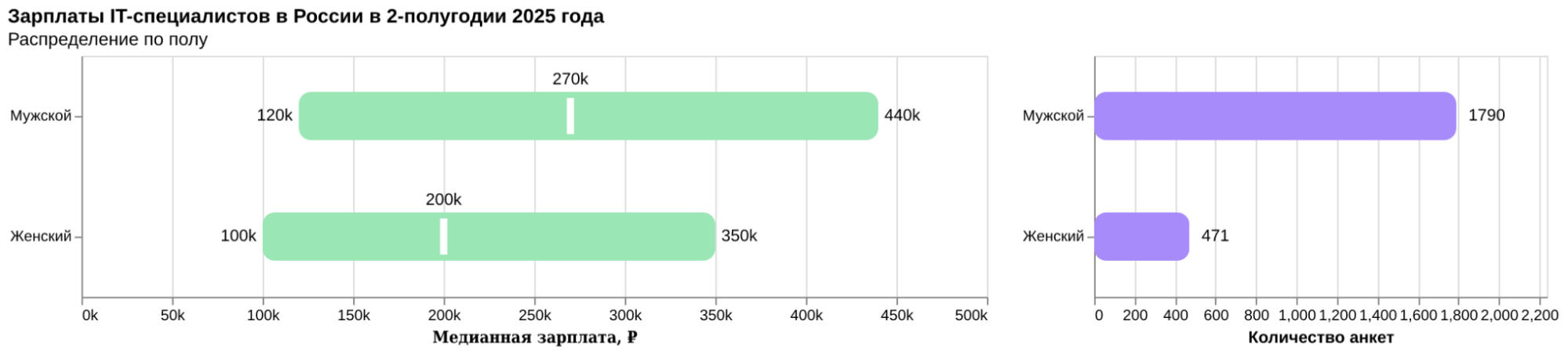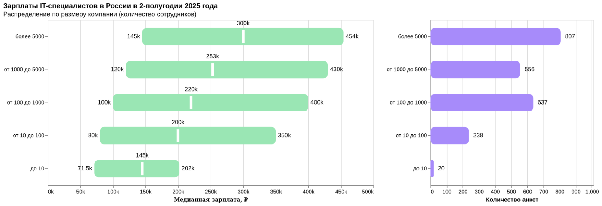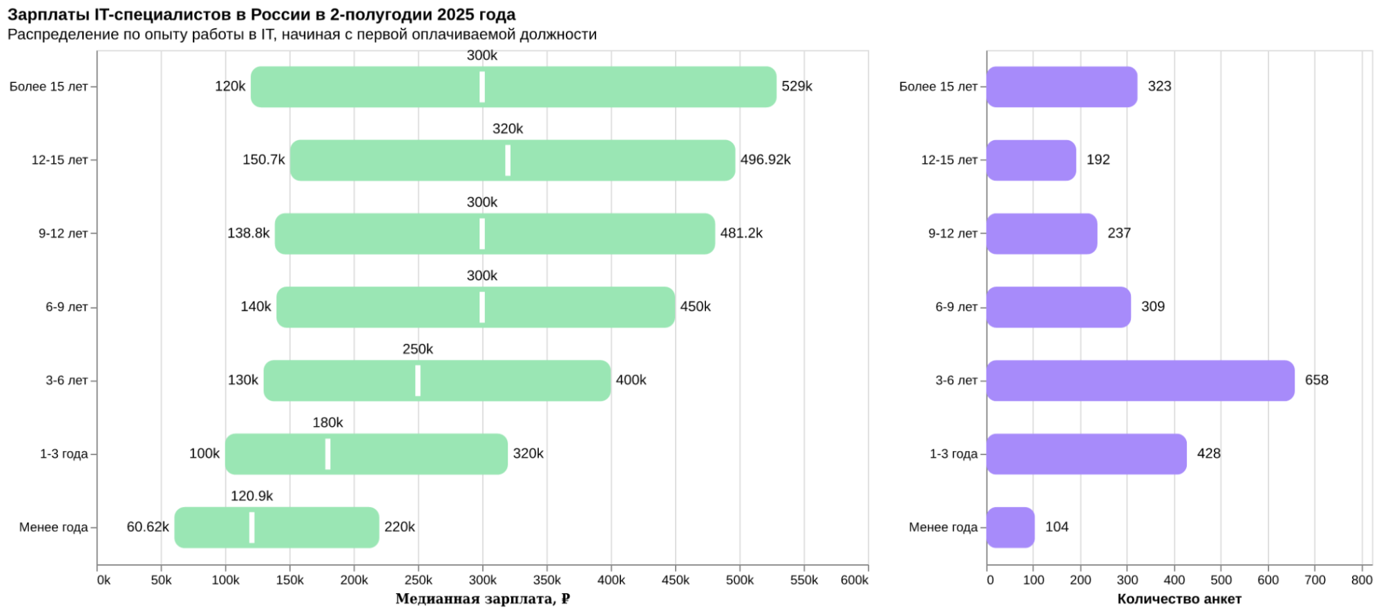 - Средняя отметка (медиана) — половина зарплат ниже этого значения, половина — выше.