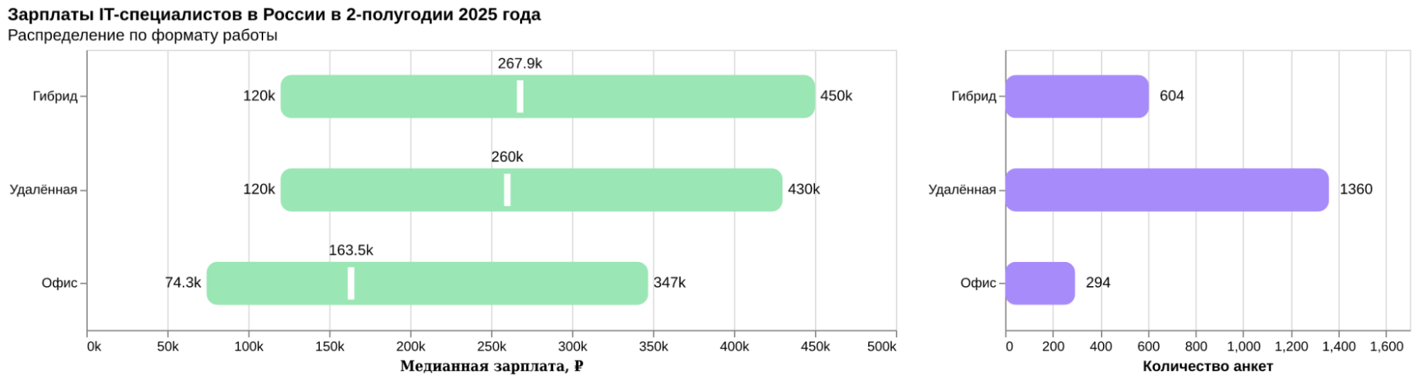 Удалённо работают 60% опрошенных. Это на 2% меньше, чем в прошлом полугодии. Зарплата тех, кто работает на удалёнке и в гибридном режиме, составляет 260 и 268 тыс. рублей соответственно. Это почти на 100 тыс. рублей больше, чем у тех, кто работает в офисе.