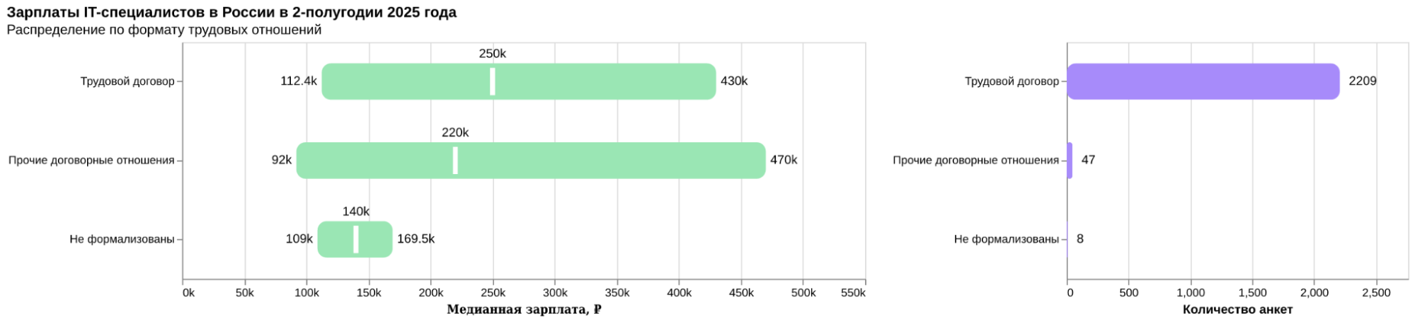 В который раз убеждаемся, что для наёмного сотрудника выгоднее работать по трудовому договору. Таких набралось 97%. Их медианная зарплата на 30 тыс. рублей выше, чем у тех, кто трудится как ИП или самозанятый.